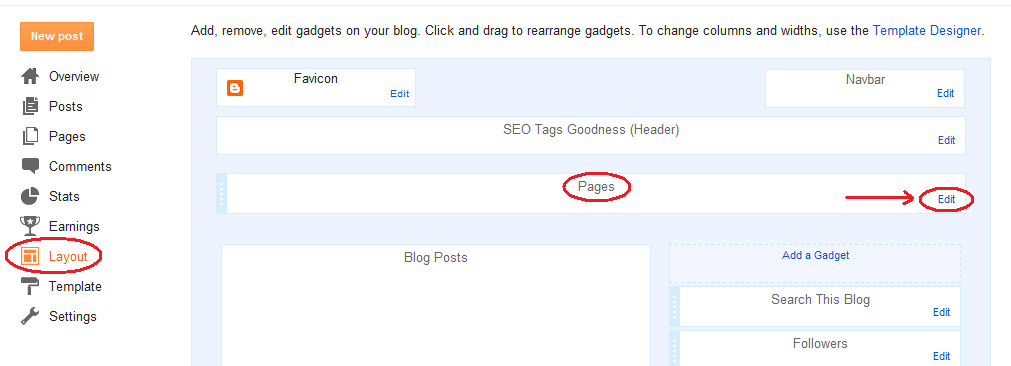 The very last step is to hide the original Home page link and add a page link to your blog pages so that the visible tabs work correctly. First, enable tabs from the Pages menu:Be sure to press 'Save arrangement' in the upper right of the screen (not seen here)! When you go to your home page you should now see the tab bar across the top of your blog. However, now when you click on either Home or Home Page you're going directly to your new static page. What you have to do at this point is hide the original 'Home' Page using the Layout editor. Open the Layout using the editor from the Blogger main menu: